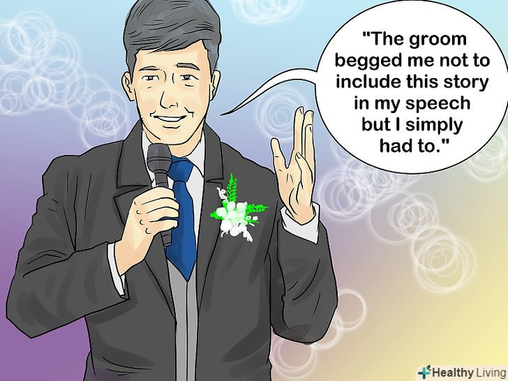 Розкажіть зворушливу історію.основна частина вашої промови повинна містити коротку розповідь про нареченого і, можливо, наречену. Хоча метою цієї розповіді є надання вашому виступу більш особистого характеру, уникайте розповіді невтішних подробиць з минулого. З історії має бути зрозуміло чому наречені-ідеальна пара, або чому наречений прекрасно підходить нареченій. Ось як це можна зробити: [4]- Розкажіть смішну історію. Це розбавить формальність церемонії і розташує гостей до молодят. Відмінним способом для залучення уваги аудиторії стане наступний вступ: "зараз я збираюся повідомити вам секрет про нареченого" або " наречений просив мене не включати цю історію в мій виступ, але я просто не міг виконати його прохання."