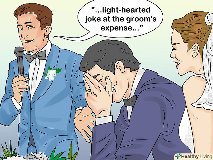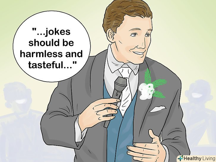 Постарайтеся уникати підняття делікатних тем. хоча вам і можуть здатися смішними жарти про набридливу колишню нареченого або про ніч, проведену у в'язниці за розпивання спиртних напоїв в громадському місці, але їх точно не оцінять наречений з нареченою і їх сім'ї. Ваш гумор повинен бути нешкідливий і тонкий; можна трохи зістрити, якщо ви на 100% впевнені, що всі гості і молодята дійсно оцінять це.- Якщо ви збираєтеся розповісти анекдот, ви повинні бути впевнені, що він буде належним, на думку всіх присутніх; ніхто не повинен вважати його принизливим або низьким.