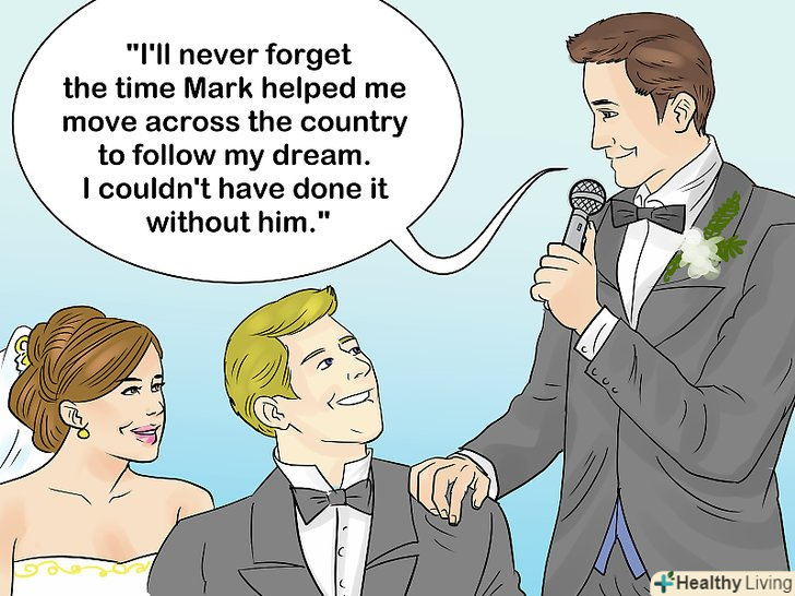 - В якості альтернативи, можна розповісти який-небудь зворушливий розповідь. Наприклад, можна розповісти про те, як молодята познайомилися, і згадати якісь милі факти, які допомогли зміцнити їхні стосунки. Так як ви кращий друг нареченого, можете згадати про те, як стрімко росли почуття нареченого до нареченої.