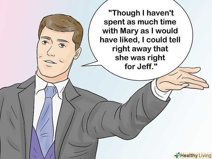 Розкрийте хороші якості нареченого.наприклад, розкажіть про його вірності, його здатності до співчуття, або про те, як сильно він любить наречену і що він буде їй чудовим чоловіком. У певному сенсі уявіть собі, що ви продавець, якому потрібно продати нареченого членам сім'ї нареченої, які не знають його так само добре, як знаєте ви. Розкажіть, який він хороший друг як він допоміг пережити вам важкий період вашого життя.- Розкажіть про те, як наречений допоміг вам. Наприклад ," я ніколи не забуду, як він допоміг мені переїхати в інший кінець країни, щоб виконати мою мрію. Без нього я не зміг би цього зробити. "