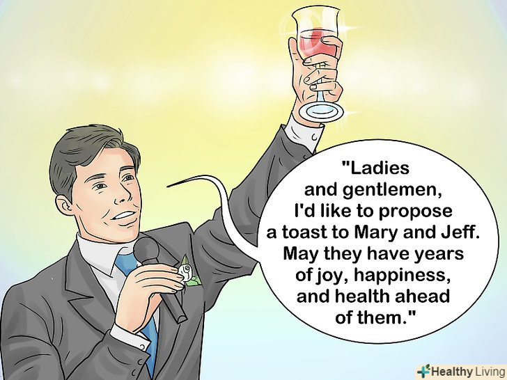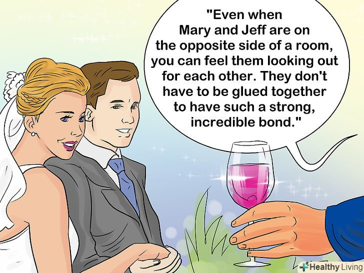 Скажіть що-небудь хороше про відносини молодят.такі слова будуть прекрасним завершенням вашої мови, особливо якщо вона була сповнена жартів про нареченого. Ви можете сказати, як добре молодята підходять один одному і що відразу видно яка у них сильна любов і як добре вони один одного доповнюють.- Наприклад, можна сказати: "навіть коли наречений і наречена знаходяться в різних частинах кімнати, вони постійно шукають один одного очима. Вони пов'язані узами міцної любові."