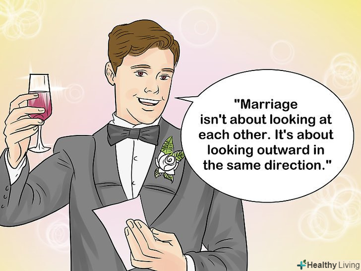 Прикрасьте промову цитатою.це не обов'язково, але цитата буде прекрасним переходом між промовою про молодят і пропозицією тосту. Можна пошукати натхнення онлайн або просто використовувати відому цитату про шлюб: “вступати в шлюб потрібно не з тим, з ким ви могли б жити, а з тим, без кого ви жити не можете.”- Не потрібно використовувати будь-яку цитату, якщо ви не знайшли дійсно підходящу. Наприклад: "у шлюбі потрібно дивитися не один на одного, потрібно дивитися в одному напрямку. "