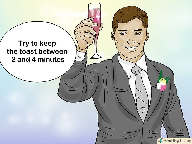 Будьте короткі.не варто обмежуватися лише словом" вітаю " або промовою в один рядок, але в той же час не треба говорити без угаву: цей не ваш день. Ваша мова повинна тривати рівно стільки, щоб вам вистачило часу висловити свої думки. Постарайтеся вкластися в 2-4 хвилини, у більшості людей немає терпіння Слухати мови більше 5 хвилин. Поцікавтеся у нареченого і нареченої, якої тривалості повинна бути мова.- Хоча ви повинні приготувати і відрепетирувати вашу мову заздалегідь, перед її проголошенням придивіться до гостей: якщо вони невпинно танцюють і вживають алкоголь, значить все-таки краще зупинитися після першого анекдоту.