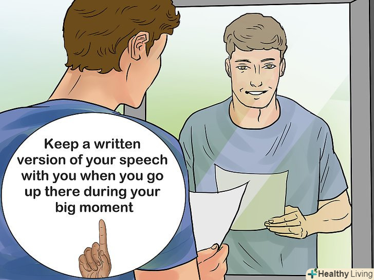 Запишіть і відрепетируйте вашу мову заздалегідь.чим швидше ви її напишіть, тим більше часу у вас буде на її вдосконалення, що в свою чергу підвищить вашу впевненість, коли ви будете стояти перед усім залом. Не думайте, що випивши багато алкоголю, вам буде легше говорити перед гостями. Швидше, це найгірше, що ви можете зробити, тому що в кінцевому підсумку все може вийти з під контролю і ви скачете щось, про що будете дуже шкодувати. Тому, щоб все пройшло гладко, дуже важливо добре підготуватися заздалегідь.- Не бійтеся взяти з собою листочок з промовою, коли ви йдете її вимовляти. Навіть якщо ви не будете підглядати, то думка, що ви завжди можете, додасть вам впевненості.