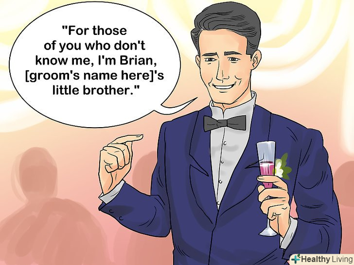 Уявіть себе.перше, що вам потрібно сказати, це хто ви такий. Хоча ймовірно, до цього часу більшість гостей вже зрозуміли, що ви-шафер, після церемонії одруження все одно потрібно сказати, хто ви і звідки знаєте нареченого і наречену. Цілком можливо, що не всі присутні знайомі з вами, тому Ви повинні розповісти хто ви, як ви познайомилися з нареченим і нареченою і скільки часу ви їх знаєте. Запам'ятайте вступний рядок, щоб добре почати вашу мову, навіть якщо повністю її не вивчили. Ось як можна себе уявити:- " для тих, хто мене не знає, Мене звуть Брайан, я молодший брат [ім'я нареченого]."