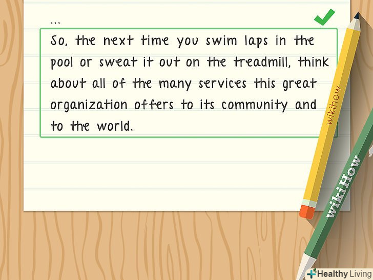 На закінчення повторіть основні ідеї.Побудуйте мову за таким принципом:»розкажіть про те, що хочете розповісти, викладіть матеріал, потім розкажіть про те, що Ви розповіли". Потрібно підсумувати свою тезу і ключові ідеї, але не повторювати їх слово в слово. Також можна пов'язати тему мови з повсякденним життям, щоб зблизитися з аудиторією і підкреслити важливість питання.[12]- Так, на закінчення можна сказати: "при вивченні факторів, які поклали початок Першій світовій війні, проявляється особливий вплив націоналізму. Навіть через століття після подій війни протистояння ідей націоналізму і глобалізму продовжує визначати міжнародну політику в 21 столітті».