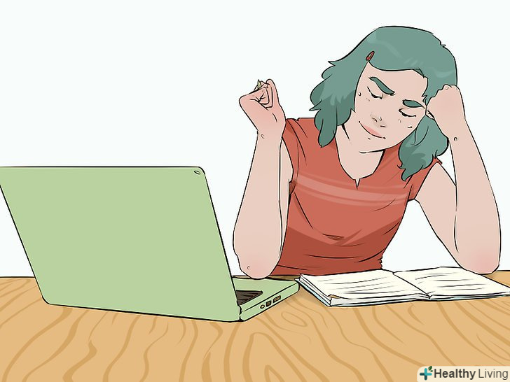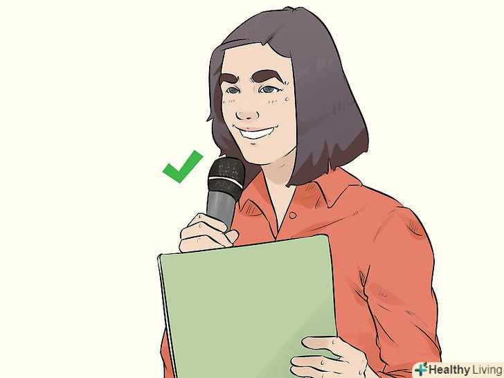 Висловлюйте впевненість за допомогою зорового контакту, жестів і постави.жестикулюйте, щоб підкреслювати слова та ідеї, а також підтримуйте зоровий контакт зі слухачами. Переводьте погляд кожні 5-10 секунд, щоб не дивитися в одну точку.[15]- Не сутультесь, стійте рівно і розпряміть плечі. Крім впевненості, хороша постава допоможе глибше дихати і говорити рівним голосом.