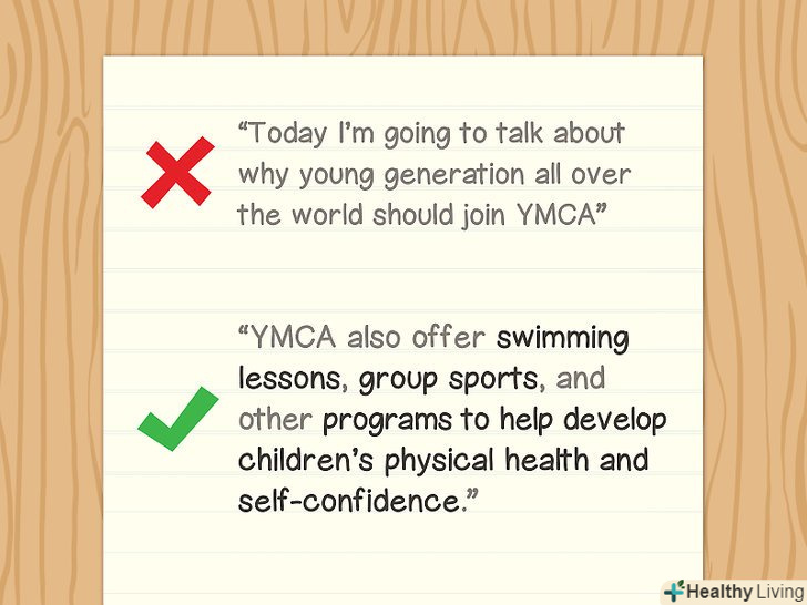 Інформуйте, а не переконуйте слухачів.Пам'ятайте, що інформаційна мова не має на меті переконати слухачів у вашій правоті. Не потрібно будувати докази і волати до емоцій. Вам необхідно вимовити об'єктивну мову і чітко викласти суть теми. Структура і мова подібної мови повинні бути поетапними, а не дискусійними.[6]- Наприклад, при завданні переконати слухачів підтримати конкретну політичну партію мова напевно буде включати пафосні заяви або переконливі прийоми і волати до емоцій.
