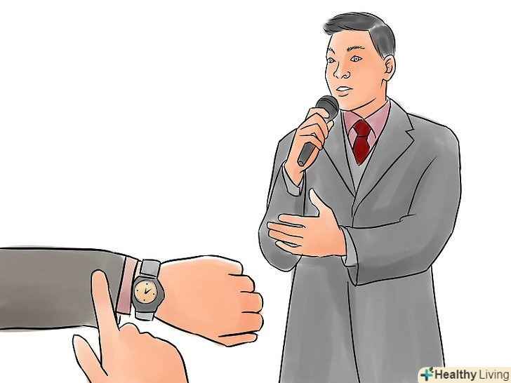 Засічіть тривалість свого виступу.можливо, у вас вже є певне уявлення про те, скільки часу воно займе, або ж вам встановили певний ліміт. Постарайтеся зробити так, щоб ваша мова була вище мінімуму, але нижче максимуму по тривалості, тоді в разі прискорення або затримки ви все одно отримаєте золоту середину.