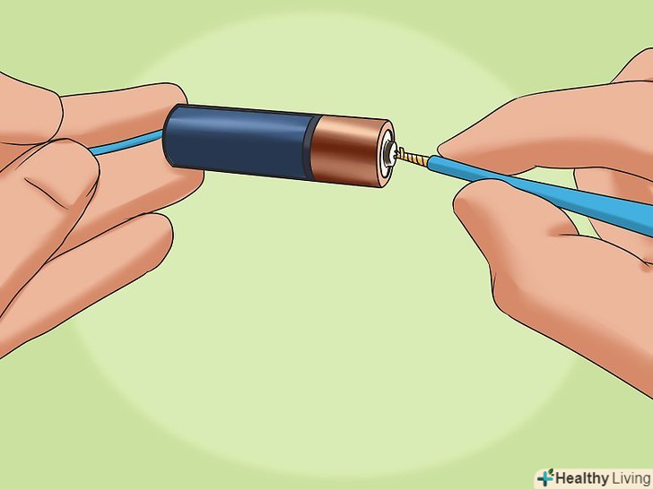 Підключіть один кінець дроту до позитивного терміналу акумулятора/акумулятора, а другий кінець-до негативного.для досягнення кращого контакту закріпіть провід за допомогою гумок або скотча.[8] також ви можете скористатися латунними шплінтами, прикріпивши їх до клем батареї, а оголений провід – безпосередньо до шплінтів.- При використанні автомобільного акумулятора при замиканні ланцюга можуть вилетіти іскри. Тримайте дріт за його ізольовану частину.