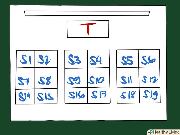 Раз на місяць міняйте місця.щомісяця розсаджуйте учнів по-іншому. Це змінює сусідів по парті і може допомогти усунути деякі проблеми з поведінкою. Щоб розсадити дітей і показати кожному його місце, розкладіть по партах картки з іменами.[16]