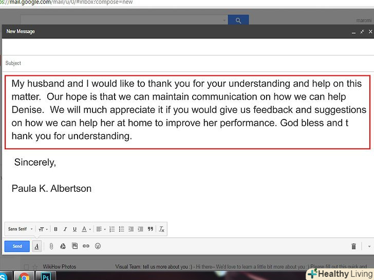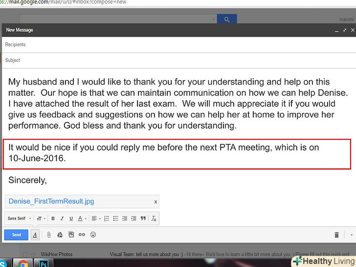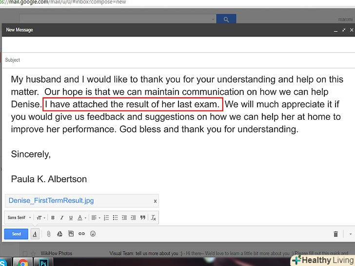 Додайте відповідні документи.залежно від характеру Вашого листа прикладіть документи, які внесуть ясність в ситуацію. Це допоможе вчителю глибше вникнути в суть проблеми і знайти відповіді на можливі питання.- Прикладені файли повинні бути в загальнодоступному форматі.