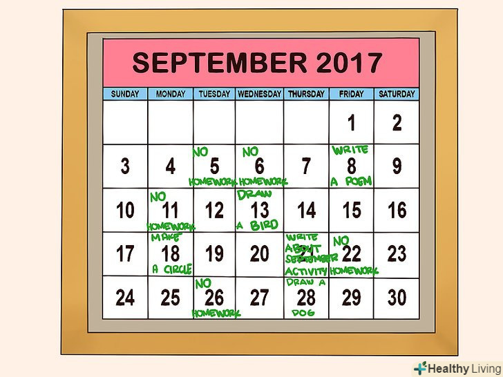Зробіть календар домашніх завдань.виконувати домашні завдання буває непросто, тому важливо залишатися організованим. Уважно стежте за тим, щоб виконувати завдання у встановлені терміни. Ви можете використовувати щоденник або настінний календар, щоб не забувати про необхідність виконувати домашні завдання. Ви також можете використовувати обидва запропоновані варіанти для додаткового нагадування.[4]- Використовуйте кольорові ручки, щоб позначати завдання в залежності від ступеня пріоритетності або рівня складності завдань.