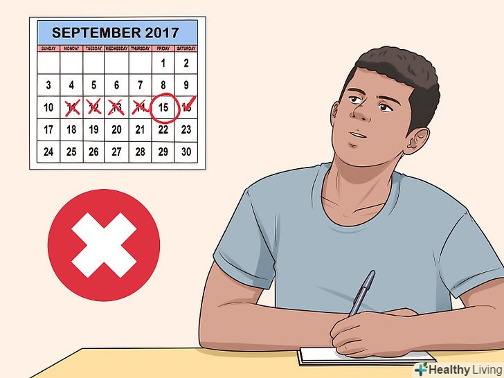 Починайте готуватися до іспиту або контрольної роботи за три тижні до призначеного терміну.не відкладайте підготовку на останній момент, так як вам не вдасться досягти хороших результатів, якщо ви погано підготуєтеся. Виділіть принаймні три тижні на підготовку до іспиту. Завдяки цьому ви зможете повторити весь матеріал, виділяючи на підготовку трохи часу за один раз. Плануйте заняття для підготовки заздалегідь і переконайтеся, що у вас є достатньо часу на виконання інших завдань.[8]- Планування допоможе зменшити рівень стресу. Завдяки цьому Вам легше буде зосередитися.
