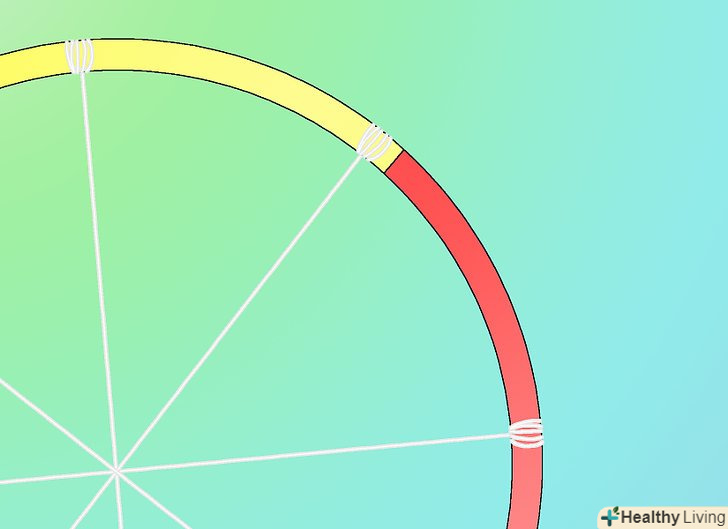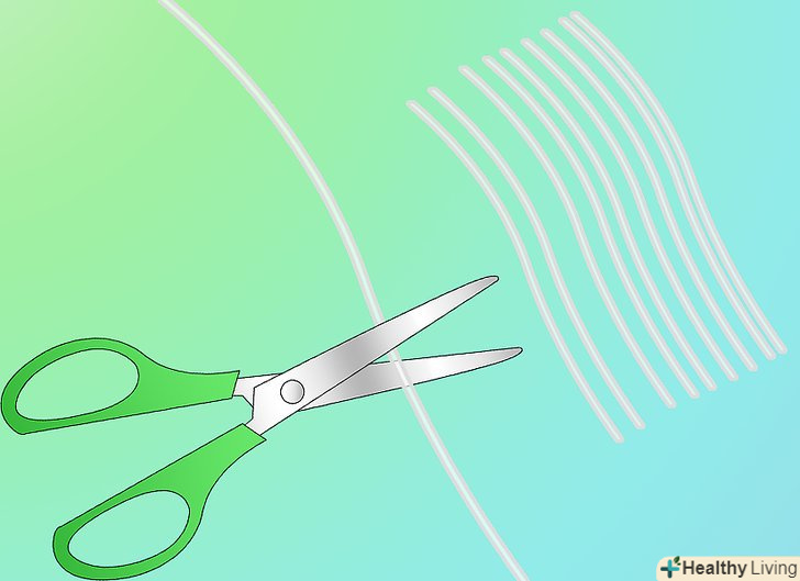 Прив'яжіть рибальську волосінь до обруча.вам необхідно прив'язати 4 секції волосіні до обруча. Почніть з одного боку обруча, потім протягніть волосінь до протилежного краю, зав'язуючи два кінці волосіні в середині обруча. Отримана лінія повинна бути пружною. Повторіть цей крок, поки 4 секції волосіні не розділять обруч на кілька частин, як пиріг.
