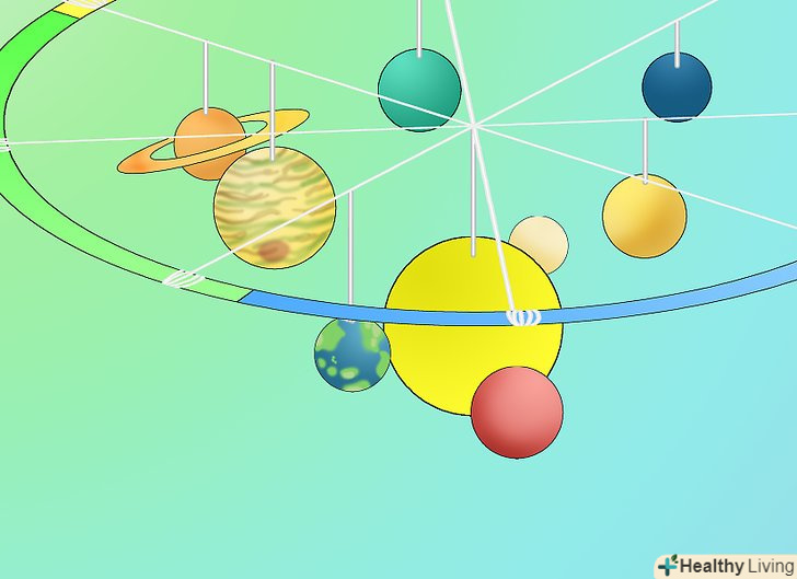 Прикріпіть планети і сонце до обруча.відріжте 9 шматочків рибальської волосіні в залежності від того, як ви хочете, щоб ваші планети висіли. Прикріпіть один край волосіні до кожної планети і Сонця клеєм або клейкою стрічкою, а інший прив'яжіть до однієї з восьми шматочків волосіні на обручі. Прив'яжіть Сонце в самому центрі, де всі лінії перетинаються. Розподіліть планети так, щоб вони були ближче або далі від сонця.