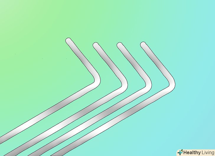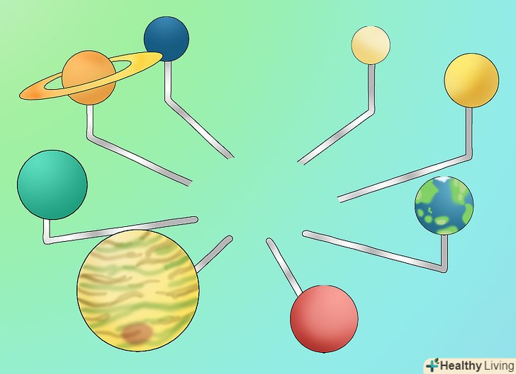 Створіть відгалуження з дроту. Візьміть довгий дріт, досить товсту, щоб утримувати форму, але і досить гнучку, щоб бути зігнутою плоскогубцями. Оберніть один кінець кожної з 8 частин дроту навколо області між Сонцем і основою, потім згорніть краю у формі букви L, щоб забезпечити місце для кожної з 8 планет навколо Сонця. Відрегулюйте довжину і висоту кожного дроту, щоб встановити планети в правильному порядку і в потрібній позиції.- Встановіть планети таким чином, щоб найдальша планета від сонця була на найнижчій дроті, а найближча – на самій верхній.