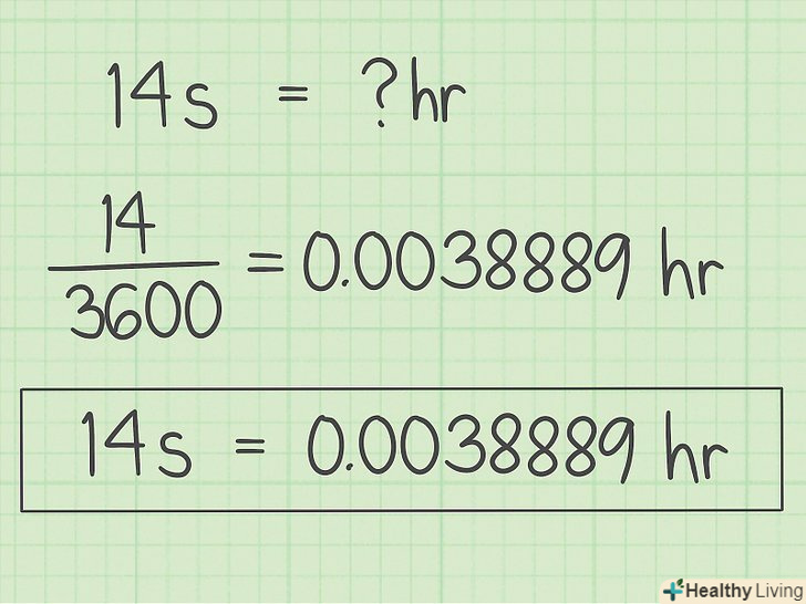 Розділіть кількість секунд на 3600.Пам'ятайте, що в одній годині 3600 секунд.[1] Таким чином, якщо вам дано більше 3600 секунд, вийде більше однієї години; якщо дано менше 3600 секунд, вийде менше однієї години (тобто якась частка від однієї години).- Перший приклад: