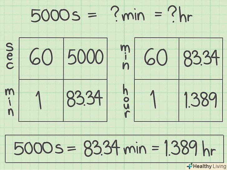 Перетворіть 5000 секунд в хвилини, а потім в години.- Намалюйте таблицю. У першому стовпці запишіть одиничну величину: 60 секунд в 1 хвилині.
