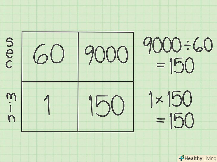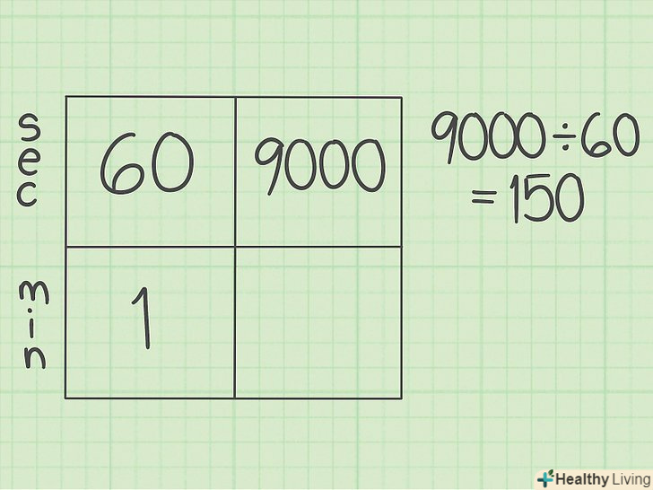 Знайдіть коефіцієнт зміни. необхідно знайти, у скільки разів кількість секунд, яке потрібно перетворити, відрізняється від кількості секунд в одиничній величині. Щоб обчислити коефіцієнт зміни, розділіть кількість секунд, яке потрібно перетворити, на 60 (це кількість секунд в одиничній величині). Знайдений коефіцієнт зміни в таблицю не записуйте.- Наприклад, якщо потрібно перетворити 9000 секунд, обчислення запишуться так:
