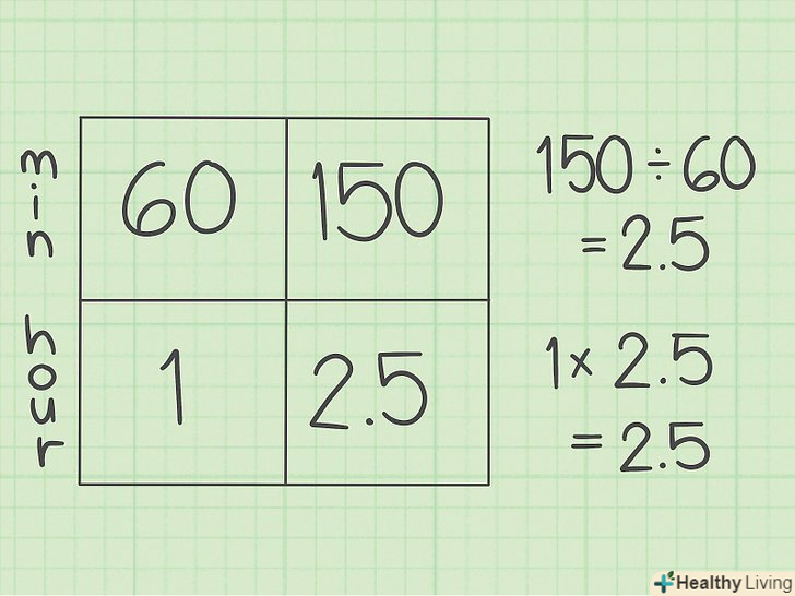Перетворіть хвилини в години.для цього намалюйте іншу таблицю, де будете працювати з хвилинами і годинами (замість секунд і хвилин). Одинична величина: 60 хвилин в одній годині. У новій таблиці використовуйте кількість хвилин (а не секунд), яке потрібно перетворити.- У нашому прикладі 9000 секунд були перетворені в 150 хвилин; тепер 150 хвилин потрібно конвертувати в годинник. Таким чином, необхідно знайти коефіцієнт зміни з 60 хвилин до 150 хвилин. Оскільки