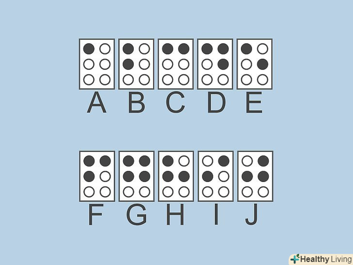 Вивчіть перші 10 букв алфавіту (A-J). ці літери використовують тільки верхні 4 точки. Нижні дві точки в них не задіяні.
