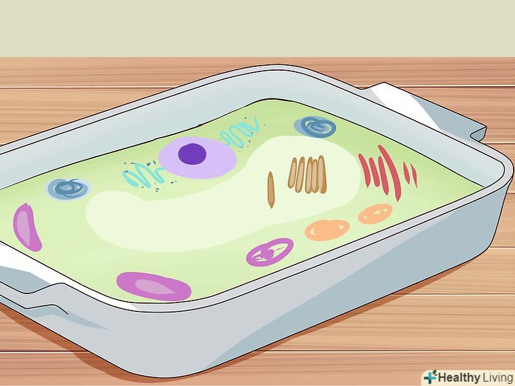 Зберіть необхідні матеріали.для створення елементів клітини вам знадобляться різні харчові продукти і кухонне приладдя. Вибір за вами. Ось деякі матеріали, які можна використовувати:- Прозорий желатин виконає роль цитоплазми. Якщо ви прагнете до точності, найкраще використовувати чистий, не ароматизований желатин. Якщо ж ви хочете створити їстівну модель, Виберіть не надто темний желатин, щоб в ньому було видно частини клітини.