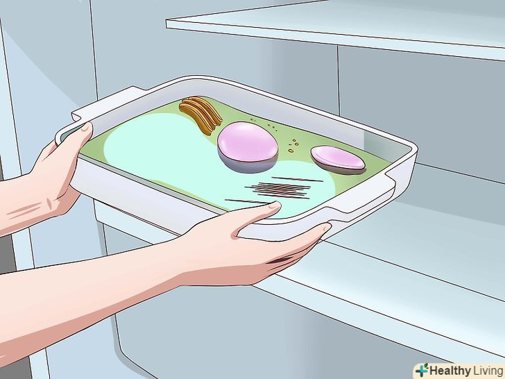 Приготуйте желатин.дотримуйтесь інструкцій, наведених на упаковці. Зазвичай необхідно довести воду до кипіння, а потім додати в неї желатин. Акуратно перелийте гарячу суміш в обрану вами каструлю або форму для випічки. Поставте її в холодильник і почекайте близько години, поки вона не почне густіти. не чекайте,поки желатин застигне повністю. Необхідно, щоб желатин застиг вже після того, як ви помістіть в нього приготовані клітинні органели.- Якщо вам не вдалося знайти чистий желатин, придбайте найбільш світлий желатин (наприклад, жовтий або помаранчевий). Можна також самостійно приготувати желатин з підручних продуктів.