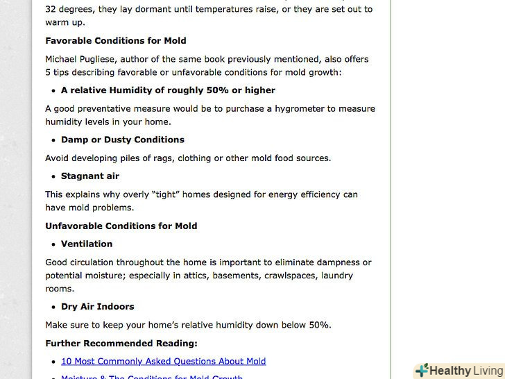 Зверніть увагу на три моменти, які неодмінно слід знати.цвілеві гриби є живими істотами, а структура їх клітин більше схожа на структуру клітин тварин, ніж рослин. Як і всі живі істоти, цвілеві гриби потребують води, харчування і в місці проживання.- Подібно тваринам, цвіль (і всі гриби) не можуть виробляти їжу. Всі калорії і поживні речовини, які їм необхідні для нормального функціонування, вони отримують із зовнішнього джерела. Однак цвіль всеїдна. Її можна зустріти на продуктах, багатих крохмалем, або на фруктах і овочах. Крім того, вона непогано уживається у вологому гіпсокартоні і подібних матеріалах.[5]