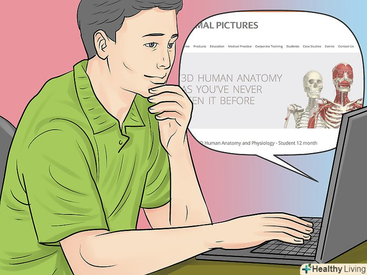 Знайдіть інтернет-ресурси.користуйтеся веб-сайтами та навчальними програмами, щоб зміцнити свої знання. Можна завантажити додатки, в яких є можливість працювати з онлайн-моделями, які допоможуть вивчати різні частини тіла, можна скласти Цифрові картки для кращого запам'ятовування термінів.[10]- Інтернет-матеріали повинні бути лише доповненням до вашого навчання. Не варто вчитися тільки по інтернет-ресурсах. Заняття в лабораторії, лекції та семінари необхідні для вивчення анатомії.