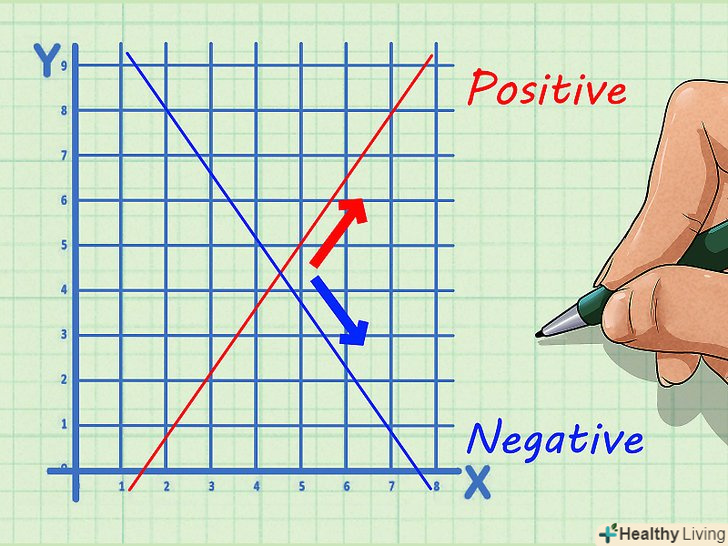 Звертайте увагу на негативні числа.кутовий коефіцієнт може бути позитивним або негативним. У разі позитивного значення пряма зростає (рухається вгору зліва направо); в разі негативного значення пряма убуває (рухається вниз зліва направо).- Пам'ятайте, що якщо і в чисельнику, і в знаменнику стоять негативні числа, то результат буде позитивним.