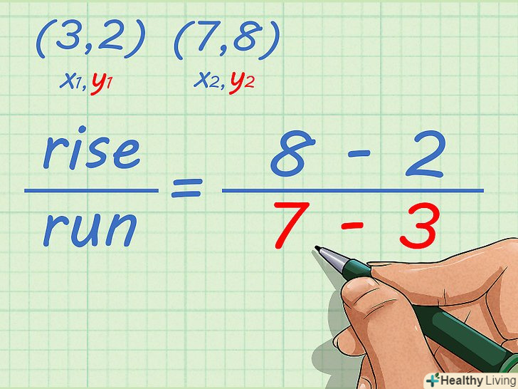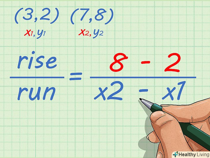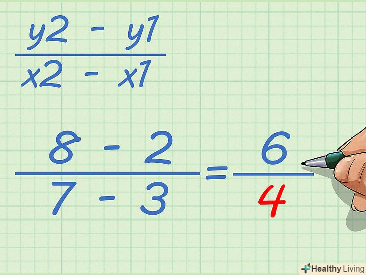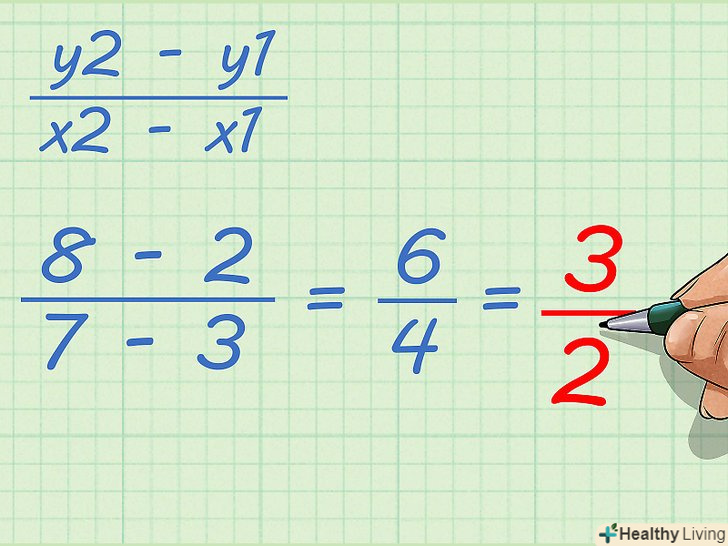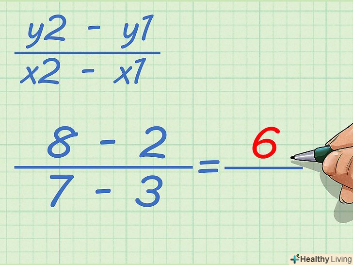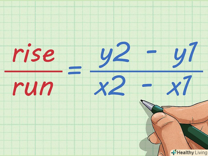 Запишіть формулу для обчислення кутового коефіцієнта. Формула:, де VR – вертикальна відстань, обумовлене зміною координати «у», GR – горизонтальна відстань, що визначається зміною координати "х".[3]