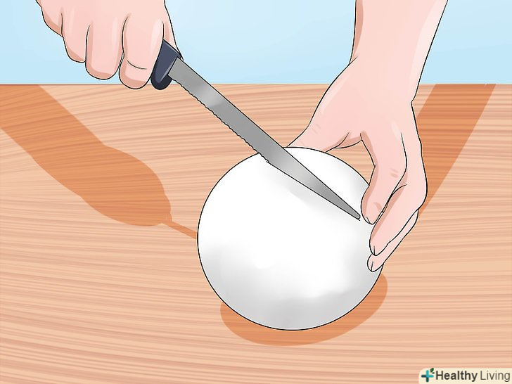 Виріжте чверть кулі.дві пересічні лінії будуть розділяти кулю на чотири частини. Вам необхідно вирізати одну чверть за допомогою ножа. Настійно рекомендуємо виконувати цю дію під наглядом батьків.[14]- Розташуйте кулю таким чином, щоб одна з ліній була спрямована точно вгору.