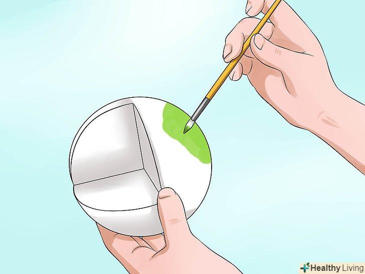 Намалюйте на зовнішній частині кулі материки і океани. Спочатку слід розфарбувати зовнішню частину моделі. Намалюйте материки олівцем, а потім пофарбуйте зеленою фарбою. Іншу площу пофарбуйте блакитним, щоб вийшли океани.[15]- Вирізана чверть кулі більше не знадобиться.