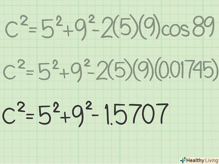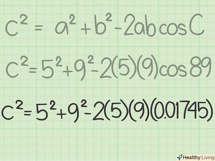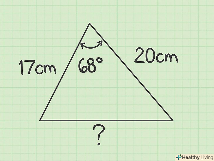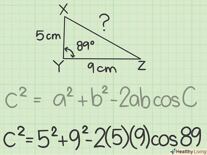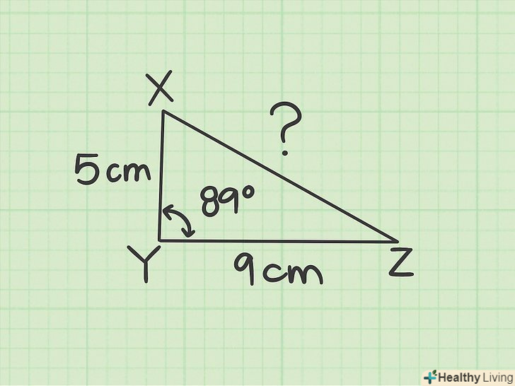 Запишіть відомі величини.щоб знайти невідому сторону трикутника, потрібно знати дві інші сторони і кут між ними.[1]- Наприклад, дано трикутник XYZ. Сторона YX дорівнює 5 см, сторона YZ дорівнює 9 см, а кут Y дорівнює 89°. Чому дорівнює сторона XZ?