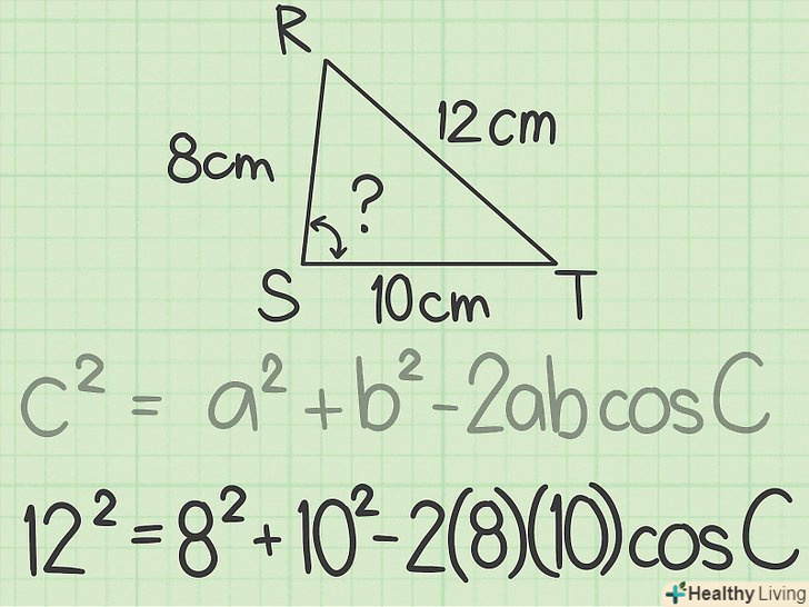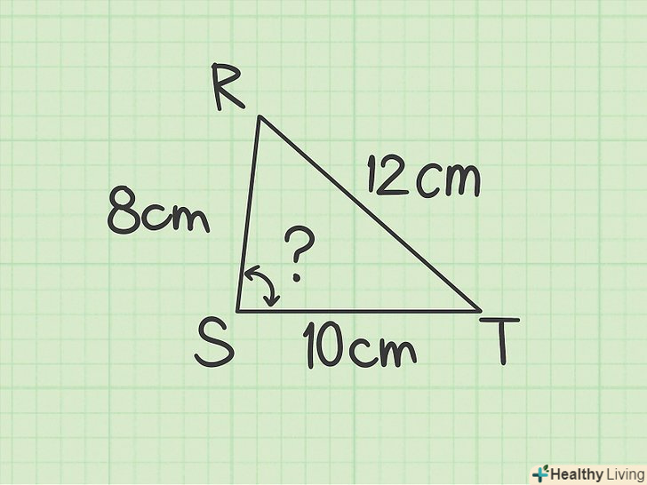 Запишіть відомі величини.щоб знайти невідомий кут трикутника, потрібно знати всі три сторони трикутника.[6]- Наприклад, дано трикутник RST. Сторона СР = 8 см, ST = 10 см, РТ = 12 см. знайдіть значення кута S.