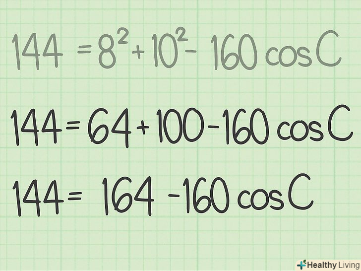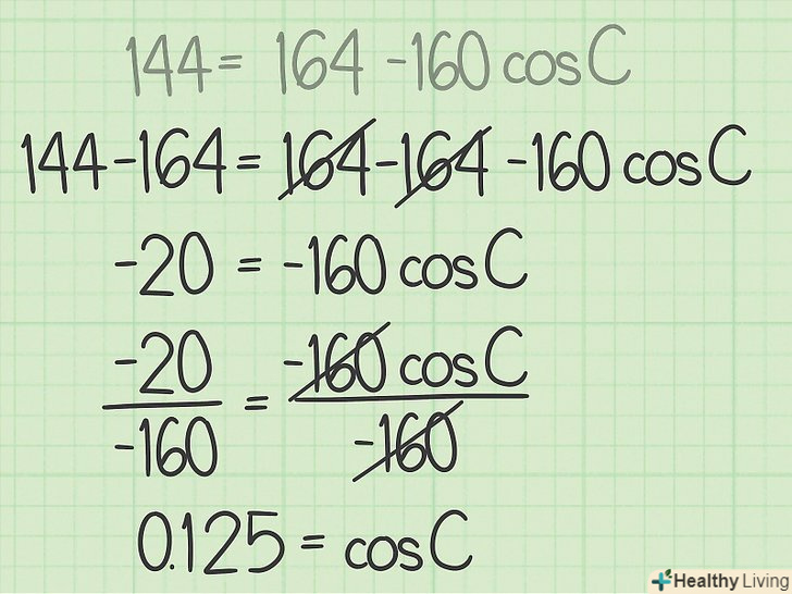 - Наприклад, щоб ізолювати косинус невідомого кута, відніміть 164 з обох сторін рівняння, а потім розділіть кожну сторону на -160: