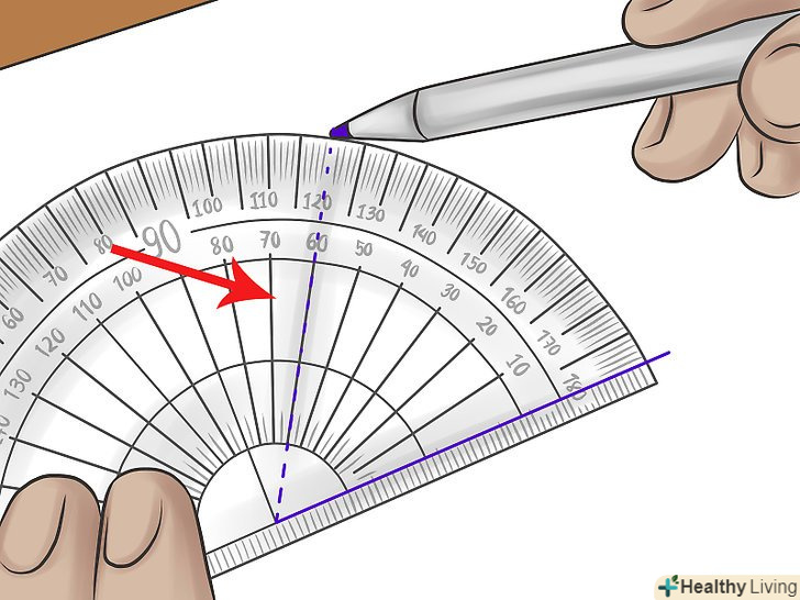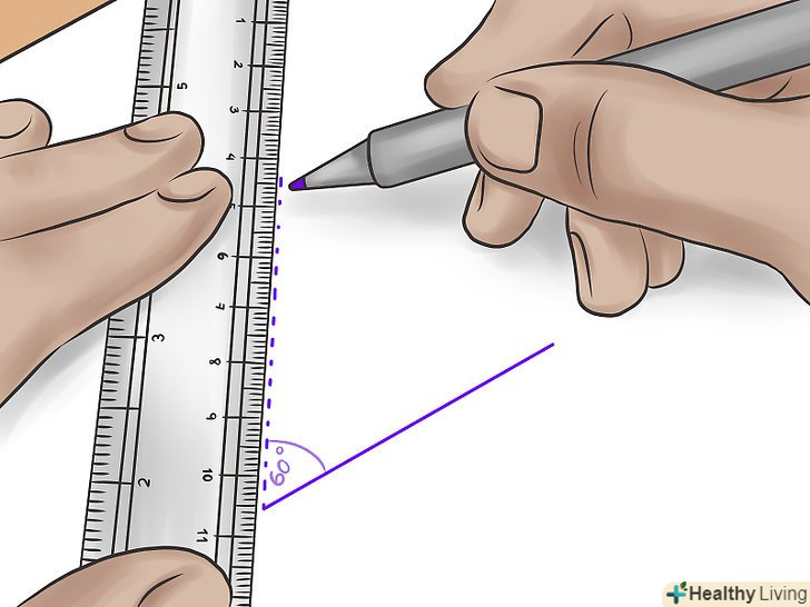 За допомогою транспортира від початкової точки першої сторони відкладіть кут, рівний 60 градусам. передбачувану другу сторону намалюйте пунктирною прямою (кут між першою стороною і пунктирною прямою повинен дорівнювати 60 градусам).