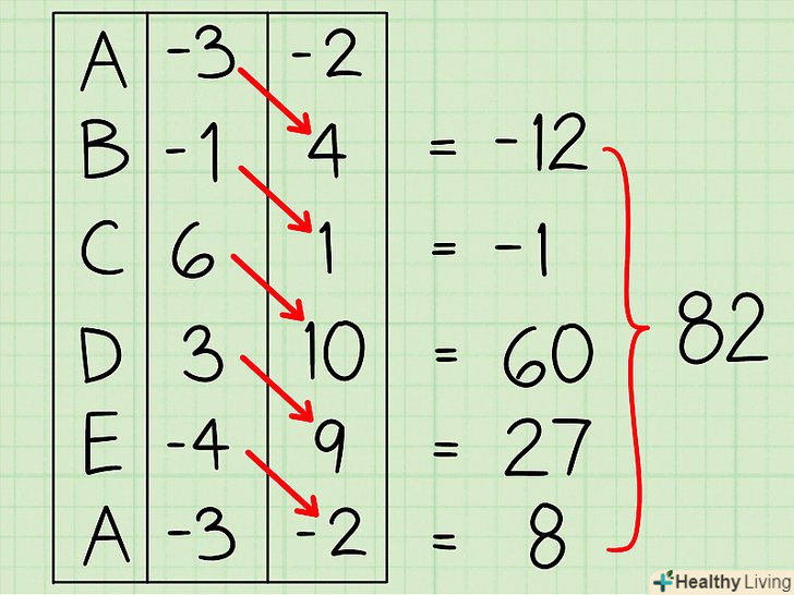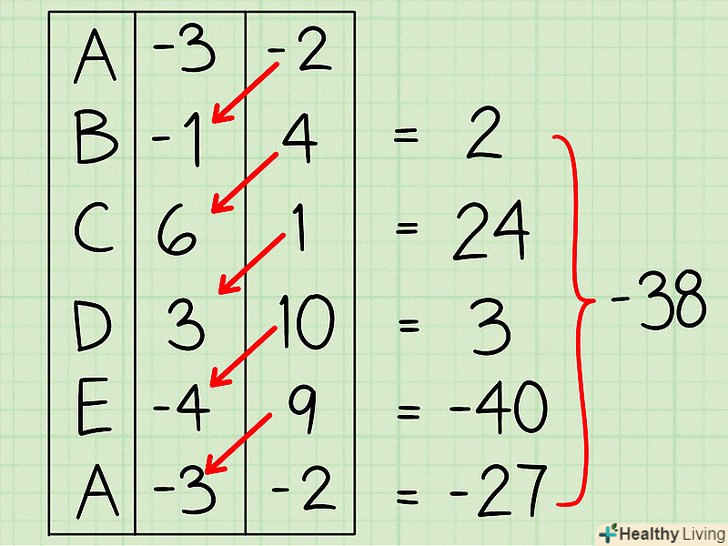Помножте значення координати» у «перший вершини на значення координати» х " другої вершини (і так далі). складіть результати (в нашому прикладі сума дорівнює -38).
