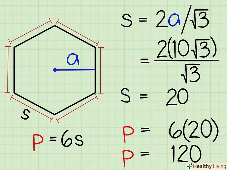 - " х " - це половина довжини підстави трикутника. Подвійте її і знайдете повну довжину підстави. У нашому прикладі підстава трикутника дорівнює 20 одиницям. У свою чергу підстава трикутника є сторона шестикутника. Таким чином, периметр шестикутника дорівнює 20 х 6 = 120.