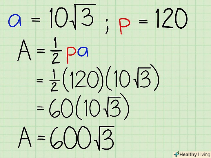 Підставте значення апофеми і периметра в формулу. у нашому прикладі:- Площа = 1/2 х 120 х 10√3