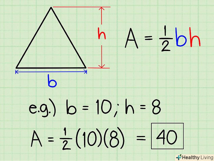 Знайдіть площу трикутника . Формула: площа = 1/2 х підстава х висота.- Якщо вам дано трикутник з підставою 10 і висотою 8, то його площа = 1/2 х 8 х 10 = 40.