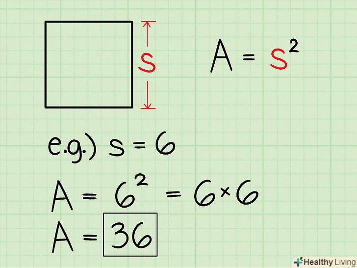 Знайдіть площу квадрата.щоб знайти площу квадрата, просто зведіть в квадрат довжину однієї його сторони. Якщо помножити підставу квадрата на його висоту, ми отримаємо ту ж відповідь, так як підстава і висота рівні.- Якщо сторона квадрата дорівнює 6, то його площа = 6 х 6 = 36.