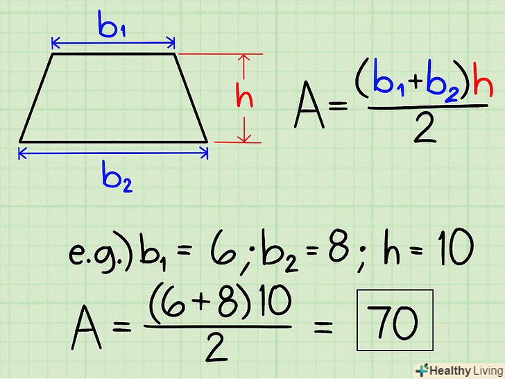 Знайдіть площу трапеції . Формула: Площа = [(підстава1 + підстава2) х Висота] / 2.- Наприклад, дана трапеція з підставами 6 і 8 і висотою 10. Її площа = [(6 + 8)•10]/2 = (14 х 10)/2 = 140/2 = 70.