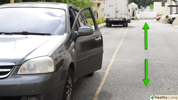 Рухайтеся по ширині дороги.потрібно продовжувати повертати ліворуч і повільно тиснути на газ, поки не опинитеся на 15 см від тротуару з лівого боку дороги.- Повністю зупиніться, натиснувши на гальмо. автомобіль виявиться перпендикулярно по відношенню до смуг руху. [2]