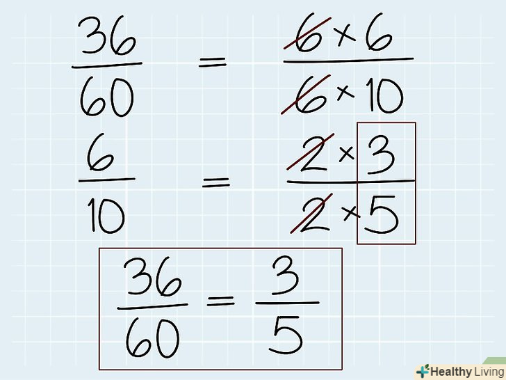 Спростіть числовий дріб.у такому дробі і в чисельнику, і в знаменнику знаходяться числа (без змінної). Числова дріб спрощується декількома способами. По-перше, просто розділіть знаменник на чисельник. По-друге, розкладіть чисельник і знаменник на множники і скоротіть однакові множники (так як при діленні числа на саме себе ви отримаєте 1). Іншими словами, якщо і у чисельника, і у знаменника є один і той же множник, його можна відкинути і отримати спрощену дріб.- Наприклад, розглянемо дріб 36/60. За допомогою калькулятора розділіть 36 на 60 і отримаєте 0,6. Але ви можете спростити цей дріб і по-іншому, розклавши чисельник і знаменник на множники: 36/60 = (6х6)/(6х10) = (6/6)*(6/10). Так як 6/6 = 1, то спрощена дріб: 1 х 6/10 = 6/10. Але цей дріб також можна спростити: 6/10 = (2х3)/(2*5) = (2/2)*(3/5) = 3/5.