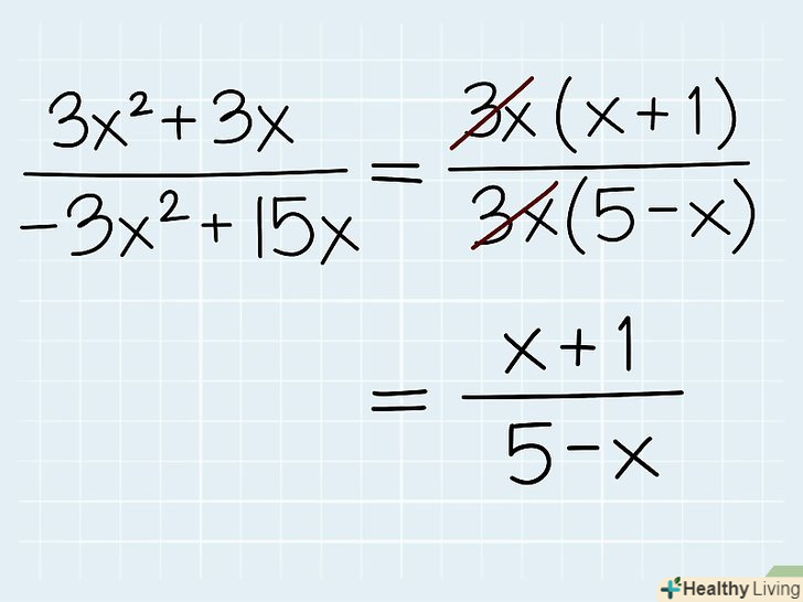 Якщо дріб містить змінну, можна скоротити однакові множники зі змінною.розкладіть і чисельник, і знаменник на множники і скоротіть однакові множники, навіть якщо вони містять змінну (пам'ятайте, що тут однакові множники можуть містити або не містити змінну).- Розглянемо приклад: (3x2 + 3x)/(-3x2 + 15x). Цей вираз можна переписати (розкласти на множники) у вигляді: (x + 1) (3x)/(3x) (5 - x). Так як член 3x знаходиться і в чисельнику, і в знаменнику, його можна скоротити, і ви отримаєте спрощений вираз: (х + 1)/(5 - х). Розглянемо інший приклад: (2x2 + 4x + 6)/2 = (2 (x2 + 2x + 3))/2 = x2 + 2x + 3.