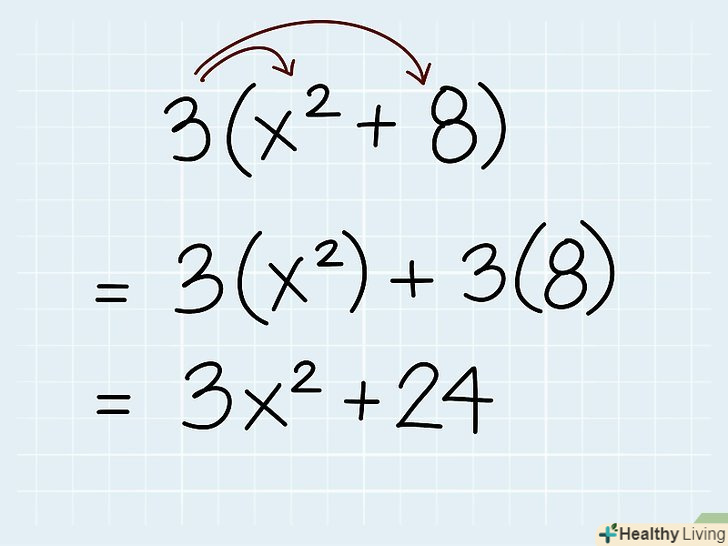 Розкрийте дужки.для цього помножте член, що стоїть за дужкою, на кожен член в дужках. Іноді це допомагає спростити складний вираз. Це стосується як членів, які є простими числами, так і членів, які містять змінну.- Наприклад, 3(x2 + 8) = 3x2 + 24, а 3x (x2 + 8) = 3x3 + 24x.