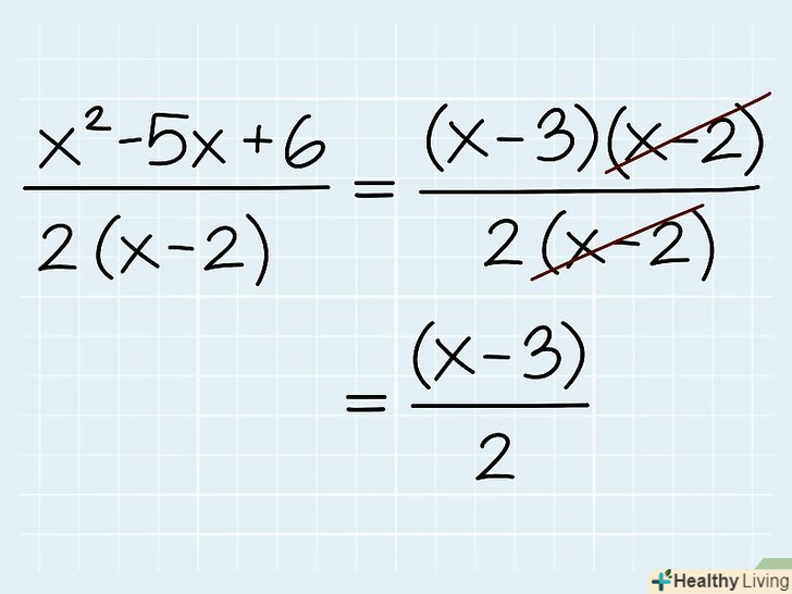 Розкладіть на множники многочлени.за допомогою цього методу можна спростити деякі вирази і многочлени. Розкладання на множники - це операція, протилежна розкриттю дужок, тобто вираз записується у вигляді добутку двох виразів, кожне з яких укладено в дужки. У деяких випадках розкладання на множники дозволяє скоротити однаковий вираз. В особливих випадках (як правило, з квадратними рівняннями) розкладання на множники дозволить вам вирішити рівняння.- Розглянемо вираз x2 - 5x + 6. Воно розкладається на множники: (x - 3)(x - 2). Таким чином, якщо, наприклад, дано вираз (x2 - 5x + 6)/(2(x - 2)), то ви можете переписати його у вигляді (x - 3)(x - 2)/(2(x - 2)), скоротити вираз (х - 2) і отримати спрощений вираз (х - 3)/2.
