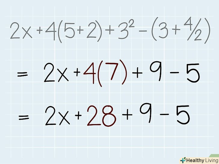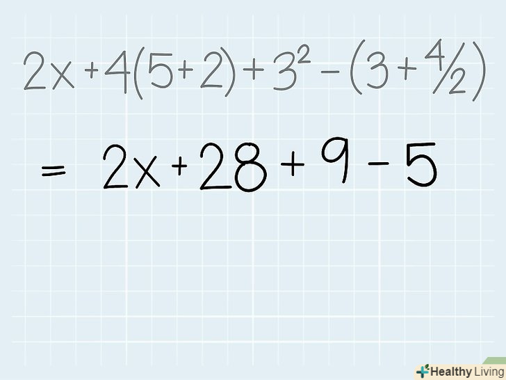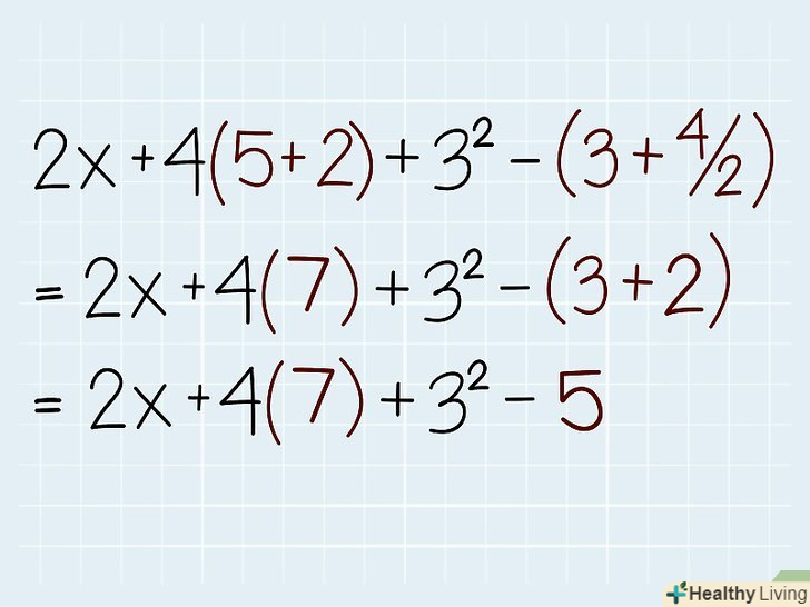 Почніть з вирішення виразу в дужках. в математиці дужки вказують на те, що укладене в них вираз має бути виконано в першу чергу. Тому при спрощенні будь-якого математичного виразу починайте з рішення виразу, укладеного в дужки (при цьому неважливо, які операції потрібно виконати всередині дужок). Але пам'ятайте, що працюючи з виразом, укладеним в дужки, слід дотримуватися порядку проведення операцій, тобто члени в дужках спочатку перемножуються, діляться, складаються, віднімаються і так далі.- Наприклад, спростимо вираз2x + 4(5 + 2) + 32 - (3 + 4/2). Тут почнемо з виразів в дужках: 5 + 2 = 7 і 3 + 4/2 = 3 + 2 =5.